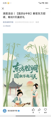 9月30日至10月8日,在国庆、中秋双节交织的欢乐氛围中,清流县图书馆精心策划并举办的“东方腔调 - 国潮答题闯关”线上答题活动,按计划圆满落下帷幕。