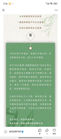 清流县图书馆“东方腔调——国潮答题闯关”线上答题活动完美收官