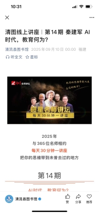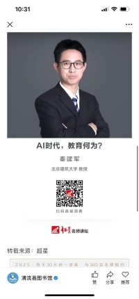 2025年清流县图书馆推出清图线上讲座系列,与365位名师相约每周30分钟一讲座,把你的思维带到未曾去过的地方。9月10日推出第14期秦建军 AI时代,教育何为?本期主讲人秦建军,北京建筑大学机器人工程系教授,美国南加州大学访问学者,教育部万名创新创业导师首批入库导师、北京市教育创新标兵,兼任中国创造学会理事等。主讲内容:全体教育工作者都要思考AI如何改善自己的工作问题。AI对学习生产力的提升远大于对教学生产力的提升。通用人工智能已见曙光,我们与AI的合作应放在优先的位置。我们应重视AI时代的综合能力,应更重视其渗透力。生成式AI对教育的冲击巨大,我们唯有以变应变。