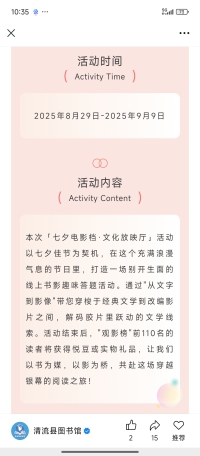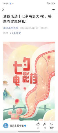 8月29日至9月9日,清流县图书馆以七夕佳节契机,举办“七夕书影大PK,答题夺奖赢好礼”线上答题活动,为读者带来别样文化体验。