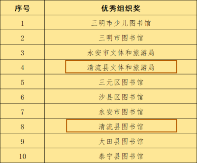 决赛现场,选手们紧扣主题,以生动的语言和饱满的情感讲述三明文旅故事,展现了新时代青少年的蓬勃朝气与责任担当,赢得了评委和现场观众的阵阵掌声。经过激烈角逐,最终决出少儿组、青少年组一等奖各2名,二等奖各3名,三等奖各5名,永安市文体和旅游局、清流县文体和旅游局、三明市图书馆、三明市少儿图书馆等10家单位获评优秀组织奖。清流县获奖情况如下:◆清流县文体和旅游局获优秀组织奖;◆清流县图书馆获优秀组织奖;◆选送选手邓依婷获演讲二等奖;◆选送选手黄杰清获征文三等奖;