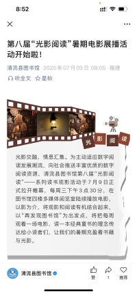光影交融,情思汇集。为主动适应数字阅读发展潮流,向社会推送丰富优质的数字阅读资源,清流县图书馆第八届“光影阅读”——系列读书观影活动于7月9日正式拉开帷幕,每周三下午3点30分,在图书馆四楼多媒体阅览室陆续播放电影,以影为介,将观影和阅读有机结合起来,以“再发现图书馆”为出发点,将把每周观看一场电影,读一本经典童书的理念传达给小读者们,让我们的暑期充盈着书籍与光影。