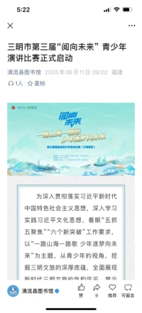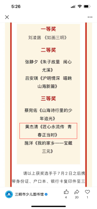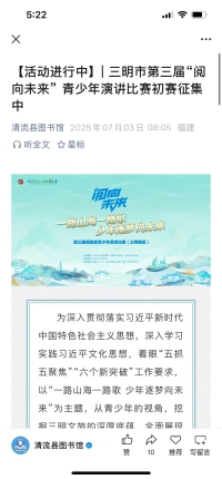 为深入贯彻落实习近平新时代中国特色社会主义思想,深入学习实践习近平文化思想,着眼“五抓五聚焦”“六个新突破”工作要求,以“一路山海一路歌 少年逐梦向未来”为主题,从青少年的视角,挖掘三明文旅的深厚底蕴,全面展现新时代三明文旅的气韵风采,展示文旅深度融合的发展成果,呈现“书香三明”的建设成效,激励引导广大青少年在新三明建设浪潮中不断成长进步,肩负起实现中华民族伟大复兴的历史使命。6月11日—7月16日,清流赛区完成征文和视频征集,分别推荐少儿组、青少年组各3个作品入围复赛,第三届福建省“阅向未来”青少年演讲比赛初赛落下帷幕。恭喜清流县城关中学黄杰清《匠心永流传 青春正当时》文章获得全市三等奖。