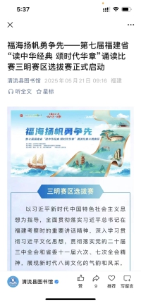 为展现新时代八闽文化的气韵和风采,推动优质文化资源直达基层,提升全民阅读氛围,引导鼓励广大人民群众积极参与诵读,在经典诵读中传承中华优秀传统文化,在新征程上开新局展新貌,为建设文化强市、建设革命老区高质量发展示范区凝聚精神力量,5月,由三明市文化和旅游局主办,三明市图书馆、福建省图书馆学会三明学组承办,各县(市、区)文体和旅游局、三明市少儿图书馆协办的福海扬帆勇争先——第七届福建省“读中华经典 颂时代华章”诵读比赛三明赛区选拔赛正式启动。清流赛区选拔于6月6日完成作品征集并落下帷幕!