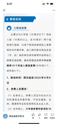 本次活动自5月21日起,为广泛征集作品,清流县加强宣传动员,通过线上微信推送和线下读者导读活动等方式,引导广大读者积极参与比赛,提高参与度,扩大覆盖面。参赛读者将通过清流县图书馆微信公众号中“2025诵读”小程序进行作品录制,录制完成后通过小程序大赛专题页面报名并上传作品。6月6日完成清流赛区选拔,共选出9人,其中少儿组6人,成人组3人参与市级选拔。6月28日,为清流赛区入围选手颁奖。