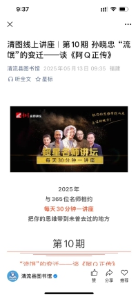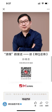 2025年清流县图书馆推出清图线上讲座系列,与365位名师相约每周30分钟一讲座,把你的思维带到未曾去过的地方。5月13日推出 第10期 孙晓忠 “流氓”的变迁——谈《阿Q正传》,本期主讲人孙晓忠,华东师范大学中文系教授,研究领域包括延安文艺、当代文学与文化批评理论。主讲内容:将从阿Q的原型溯源出发,剖析“流氓”概念的变迁,揭示国民性的深层特质。同时,我们也将探讨:阿Q的“精神胜利法”是麻木还是生存智慧?他的“革命”是觉醒还是荒诞?我们是否仍在围观阿Q的命运?