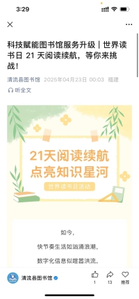为进一步推动全民阅读,培养读者良好阅读习惯,营造浓厚书香氛围,清流县图书馆于世界读书日暨公共图书馆服务宣传周期间(4月23日—5月13日),成功举办 “21 天阅读续航,点亮知识星河” 阅读打卡活动,吸引了众多读者踊跃参与,取得了良好的社会反响。