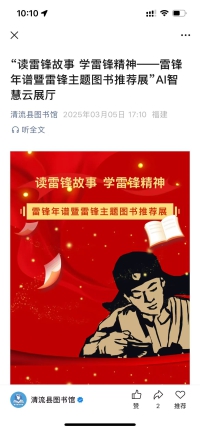 1963年3月5日,《人民日报》《解放军报》《光明日报》等全国和地方报刊发表了毛主席“向雷锋同志学习”题词,全国掀起了学习雷锋热潮,雷锋这个名字正式成为一个精神符号,深深地刻在人们心中。为传承和弘扬雷锋精神,清流县图书馆作为重要的宣传窗口,3月5日,值此学雷锋纪念日到来之际,我们准备了这样一场“读雷锋故事 学雷锋精神——雷锋年谱暨雷锋主题图书推荐展”,60余年来,雷锋精神穿越时空、传承不息,深深融入了中华民族的血脉。通过展览让我们透过这些书籍追寻雷锋的足迹,将雷锋精神世世代代弘扬下去。