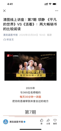 2025年清流县图书馆推出清图线上讲座系列,与365位名师相约每周30分钟一讲座,把你的思维带到未曾去过的地方。3月5日推出清图线上讲座|第7期 项静 《平凡的世界》VS《活着》:两大畅销书的比较阅读,本期主讲人项静,作家、评论家,华东师范大学中国语言文学系教授。主讲内容:提起中国当代文学,《平凡的世界》和《活着》是两部绕不开的作品。截至2023年,二者销量均已超过2000万册,成为当之无愧的当代畅销书。那么,究竟是什么原因使这两部作品能够持续触动无数读者的心灵?它们带给了读者哪些与众不同的阅读体验?让我们跟随项静老师,探寻它背后的故事。