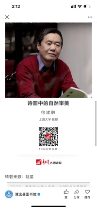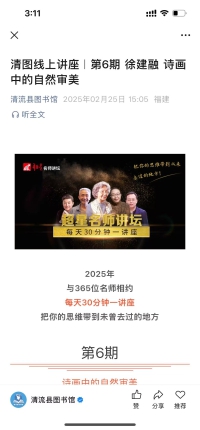 2025年清流县图书馆推出清图线上讲座系列,与365位名师相约每周30分钟一讲座,把你的思维带到未曾去过的地方。2月25日推出清图线上讲座|第6期 徐建融 诗画中的自然审美,本期主讲人徐建融,著名美术史论家、美术教育家、书画鉴定家、书画家。现为上海大学美术学院教授,博士生导师,上海市第九届、十届政协委员,享受国务院政府特殊津贴。主讲内容:将从诗歌和绘画的角度,深入探讨自然审美在历代艺术作品中的体现。揭示自然与人文景观之间的深刻关系,带领我们体验诗画中的自然之美,感受艺术创作中的自然精髓。