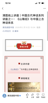 《全民阅读促进条例》于2026年2月1日正式施行,为传承中华优秀传统文化、促进全民阅读、推进书香社会建设提供了法规依据。为更好地贯彻落实习近平文化思想和习近平总书记给国图老专家回信精神,进一步传承弘扬“春节”主题的中华优秀传统文化,更好满足人民精神文化需求,营造和谐新春氛围,清流县图书馆积极参加国家图书馆和中国图书馆学会开展的2026年“策马迎春 阅享新年”春节主题活动,将国家图书馆优质资源惠及广大读者,共贺新春特推出中国古代神话系列讲座,本期内容:《山海经》与中国上古神话体系,主讲人:刘宗迪,内容摘要:《山海经》是流传至今的最古老的汉语典籍,其中记载了丰富多彩的上古神话,反映了华夏先民对于宇宙人类、日月星辰、大地山川、世间万物和人类文明的来历与意义的理解,保存了华夏民族最古老的自然知识和文化记忆。准确理解《山海经》其书,有助于我们重构华夏上古神话体系,穿越漫长的时间洪流,回到华夏文明的源头,重温华夏先民眼中那个天地相映、人神相通的神话世界。