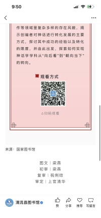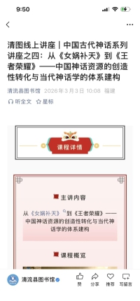 《全民阅读促进条例》于2026年2月1日正式施行,为传承中华优秀传统文化、促进全民阅读、推进书香社会建设提供了法规依据。为更好地贯彻落实习近平文化思想和习近平总书记给国图老专家回信精神,进一步传承弘扬“春节”主题的中华优秀传统文化,更好满足人民群众精神文化需求,营造和谐新春氛围,清流县图书馆积极参加国家图书馆和中国图书馆学会开展的2026年“策马迎春 阅享新年”春节主题活动,将国家图书馆优质资源惠及广大读者,共贺新春特推出中国古代神话系列讲座,本期内容:从《女娲补天》到《王者荣耀》——中国神话资源的创造性转化与当代神话学的体系建构,主讲人:杨利慧,内容摘要:神话是人类创造的最为重要的表达文化之一,它从人类的童年时期即已产生,并且一直伴随着人类的成长。然而长期以来,学界往往将神话视为远古时代的文化遗留物,这极大地限制了学者对古老神话如何与当代社会“接轨”、如何激活其在当下的生命力的探讨热情,也严重束缚了神话学学科理论和体系的创新。本讲座将以主讲人近十余年间、特别是近五年来主持的国家社科基金重大项目的研究成果为案例,生动展现中国神话在当代电影、电视、电子游戏、遗产旅游、视觉艺术和文学创作等领域里复杂多样的存在风貌,揭示创编者对神话进行转化发展的主要方式,探讨其中成功的经验以及转化的限度,并由此出发,探索如何实现神话学学科从“向后看”到“朝向当下”的转向。