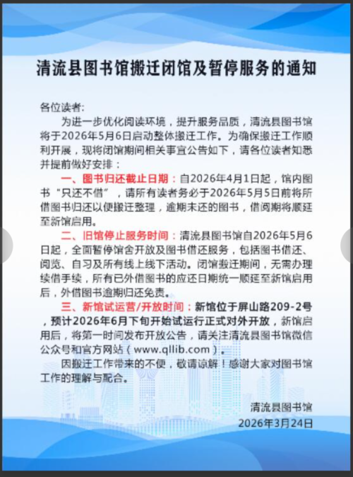 清流县图书馆搬迁闭馆及暂停服务的通知