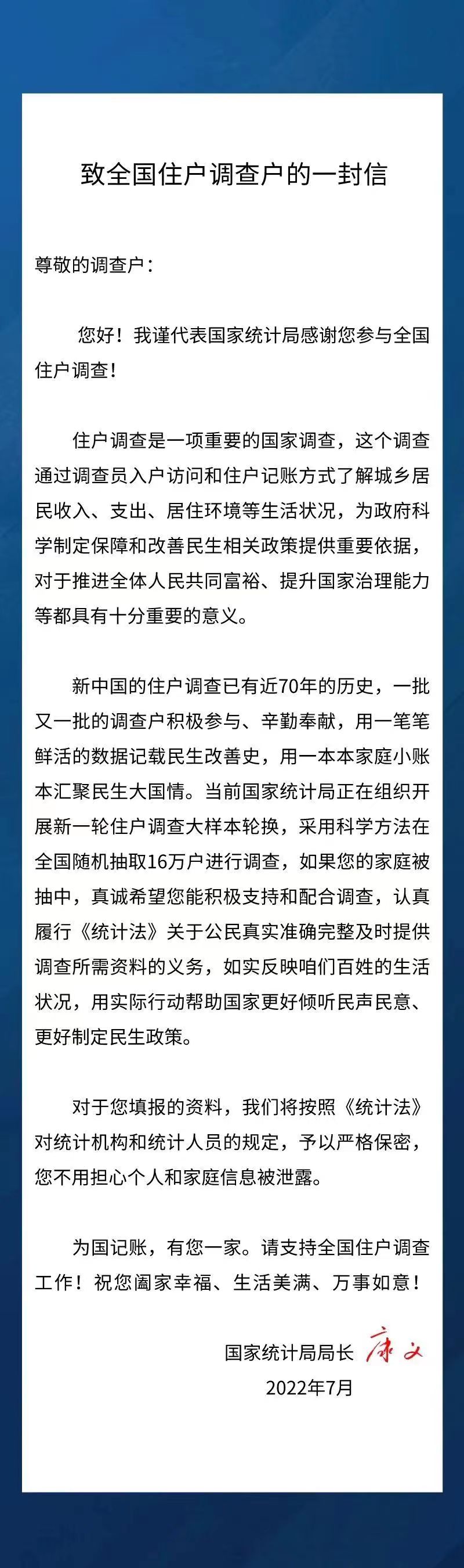 致全国住户调查户的一封信