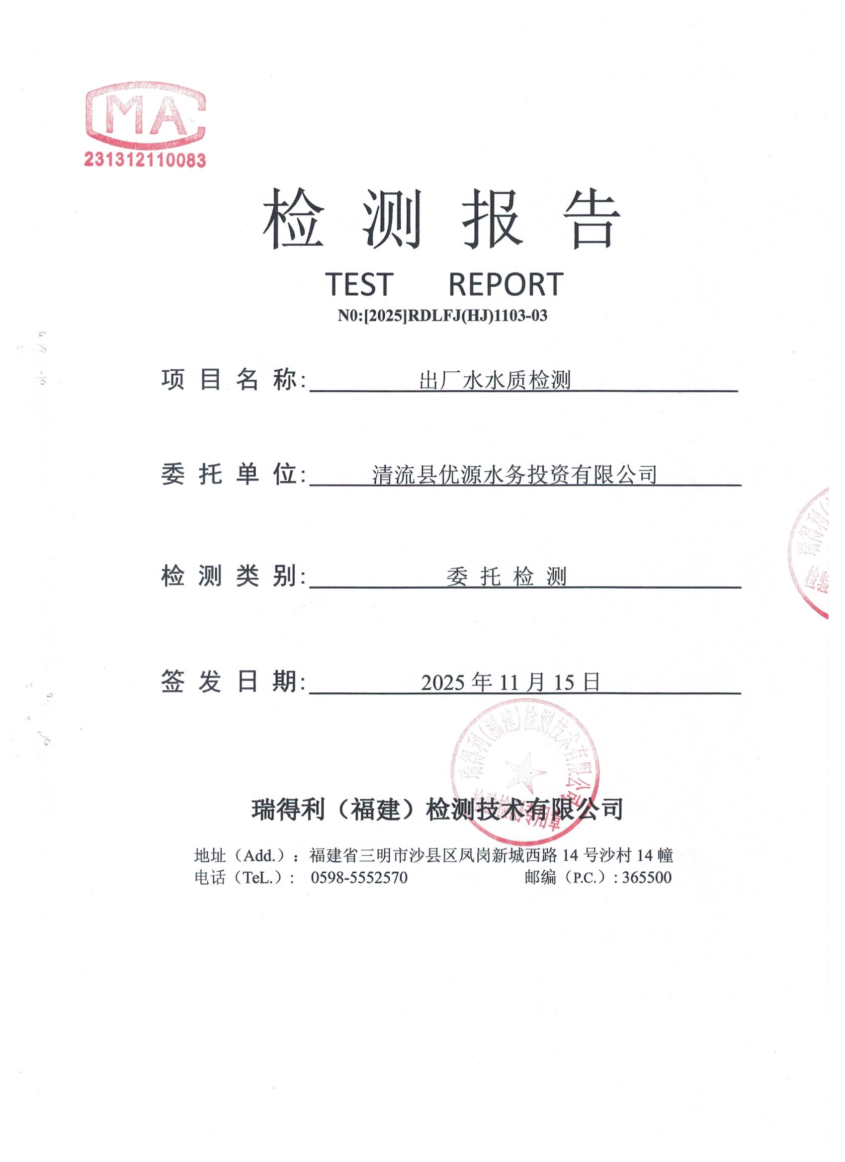 2025年清流县优源水务11月份出厂水42项检测报告