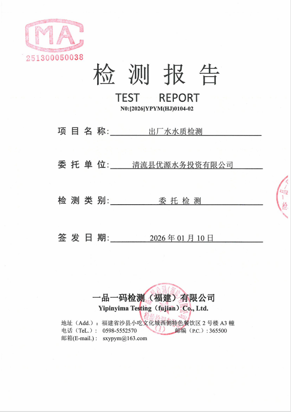 2026年清流县优源水务1月份出厂水42项检测报告