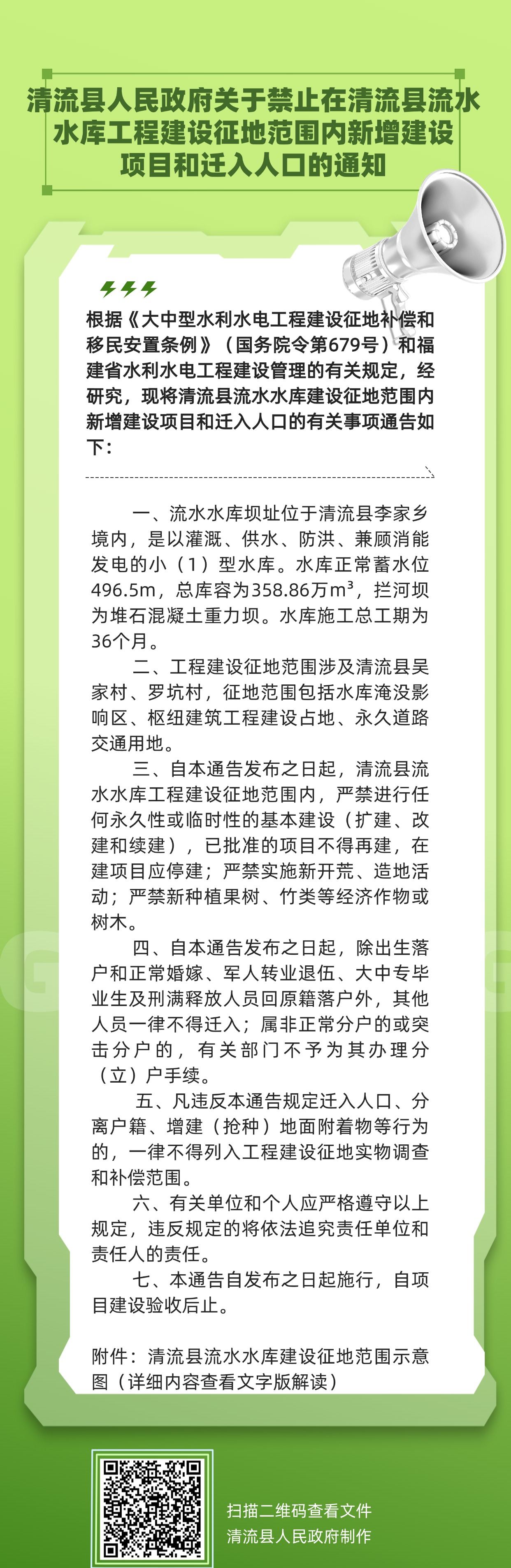 图解:《关于禁止在清流县流水水库工程建设征地范围内新增建设项目和迁入人口的通知》